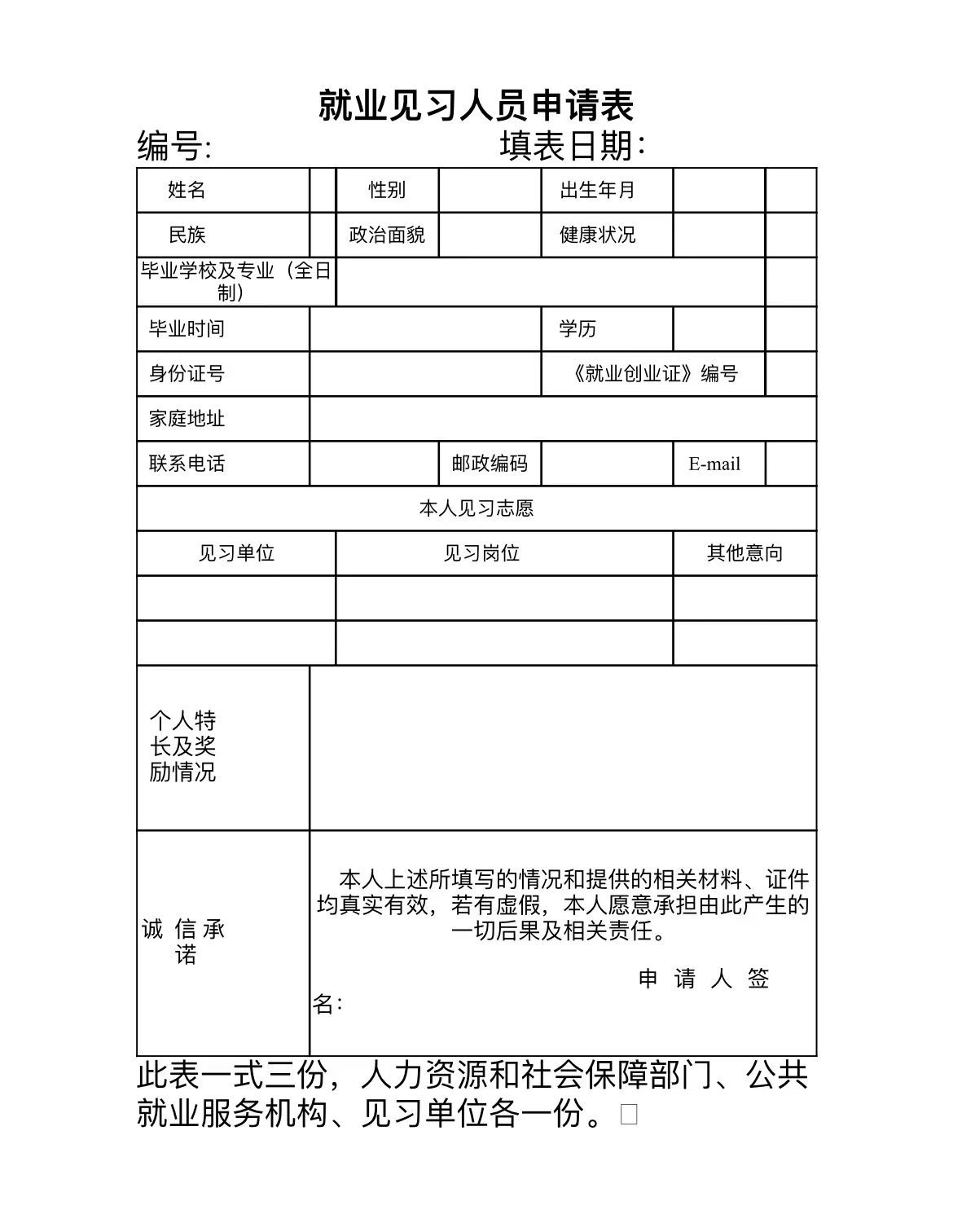 本人身份證、學歷證書、戶口薄、就業見習人員申請表(一式三份,本文末尾下載)、2張一寸免冠照片。